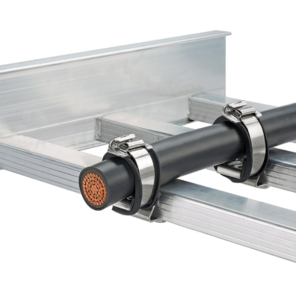 The Stainless Steel Locking Strap Cleat is an effective option for protecting against lower to medium short circuit fault current requirements in harsh environments. The strap is made of 316L stainless steel, has inherent cable range-taking, and is compatible with quad, trefoil, and multicore cables.